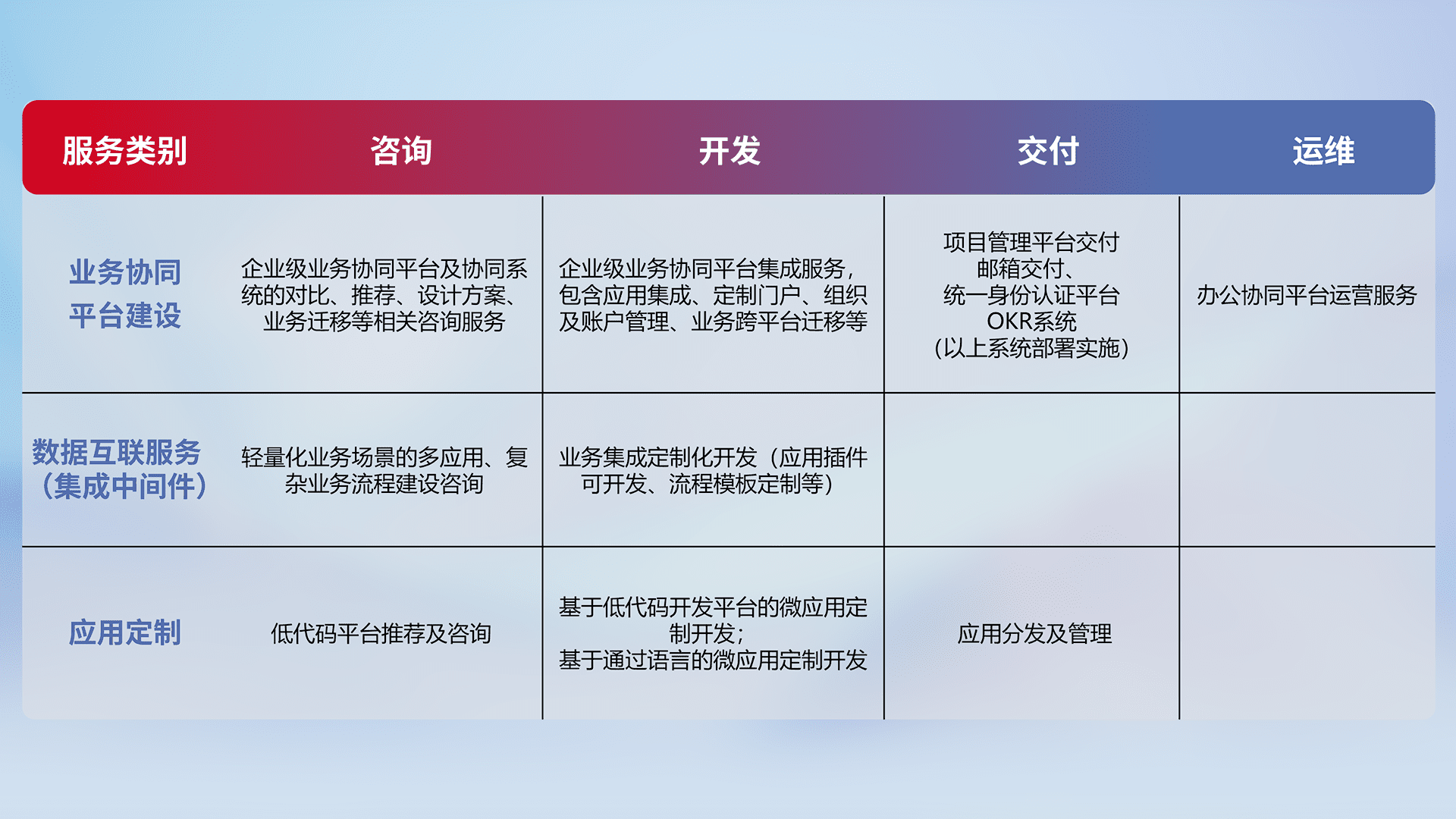 针对钉钉、、、、企微、、、IDaas等平台级产品提供产品的规划、、、方案、、交付、、、定制化开发等服务,,,,实现如统一协同办公、、、、智能客户服务、、、混合会议管理、、智能数据查询、、、等业务场景,,实现数字化转型。。。。