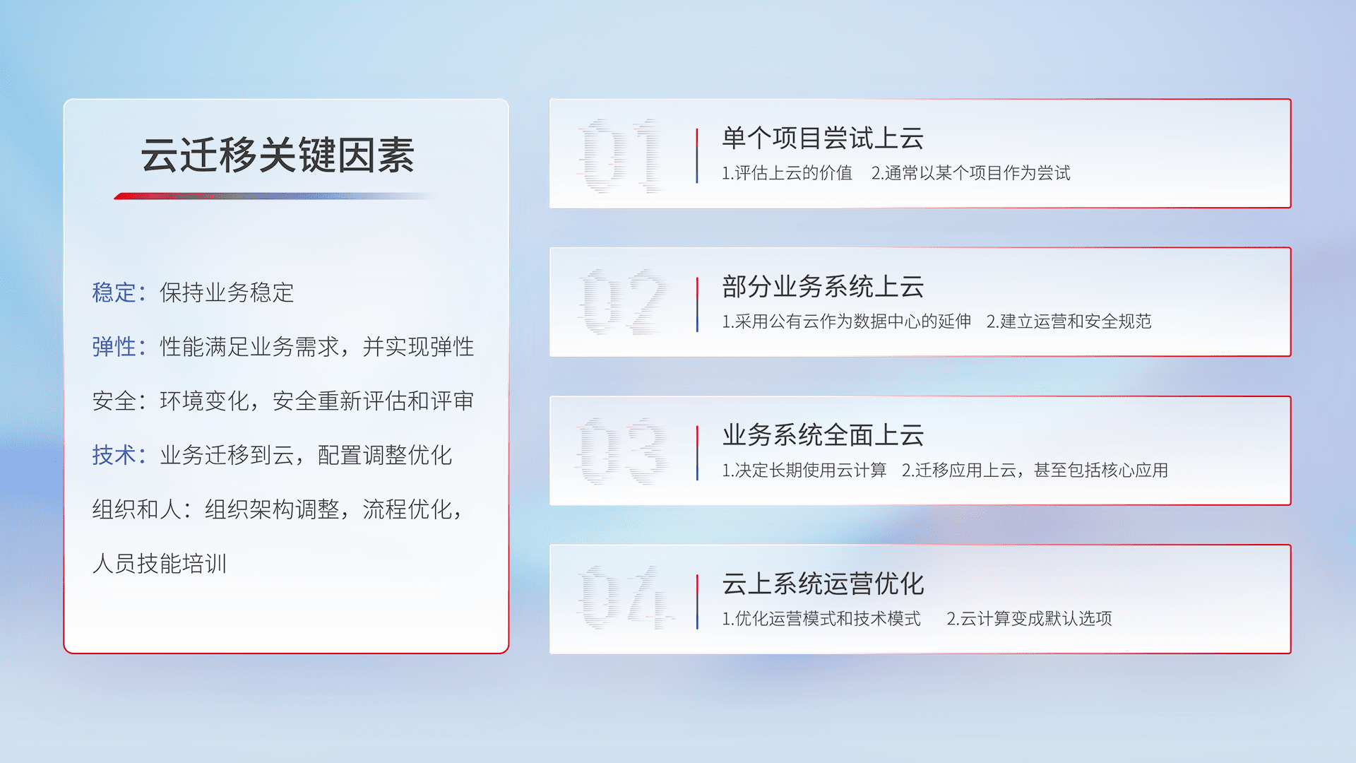 结合实际业务,,从规划设计、、云平台选型、、、云原生改造、、、、数据迁移、、、集成交付,,,迁移全过程为客户识别最佳上云路径,,,做好风险识别管理,,,设计网络架构、、身份权限、、、、安全审计合规、、、、操作审计、、日志审计、、、、监控告警策略、、多站点容灾设计等,,,,对云上基础设施进行整体规划,,,,提升IT治理水平,,,,以满足弹性、、高可用、、、、高性能的需求。。。
