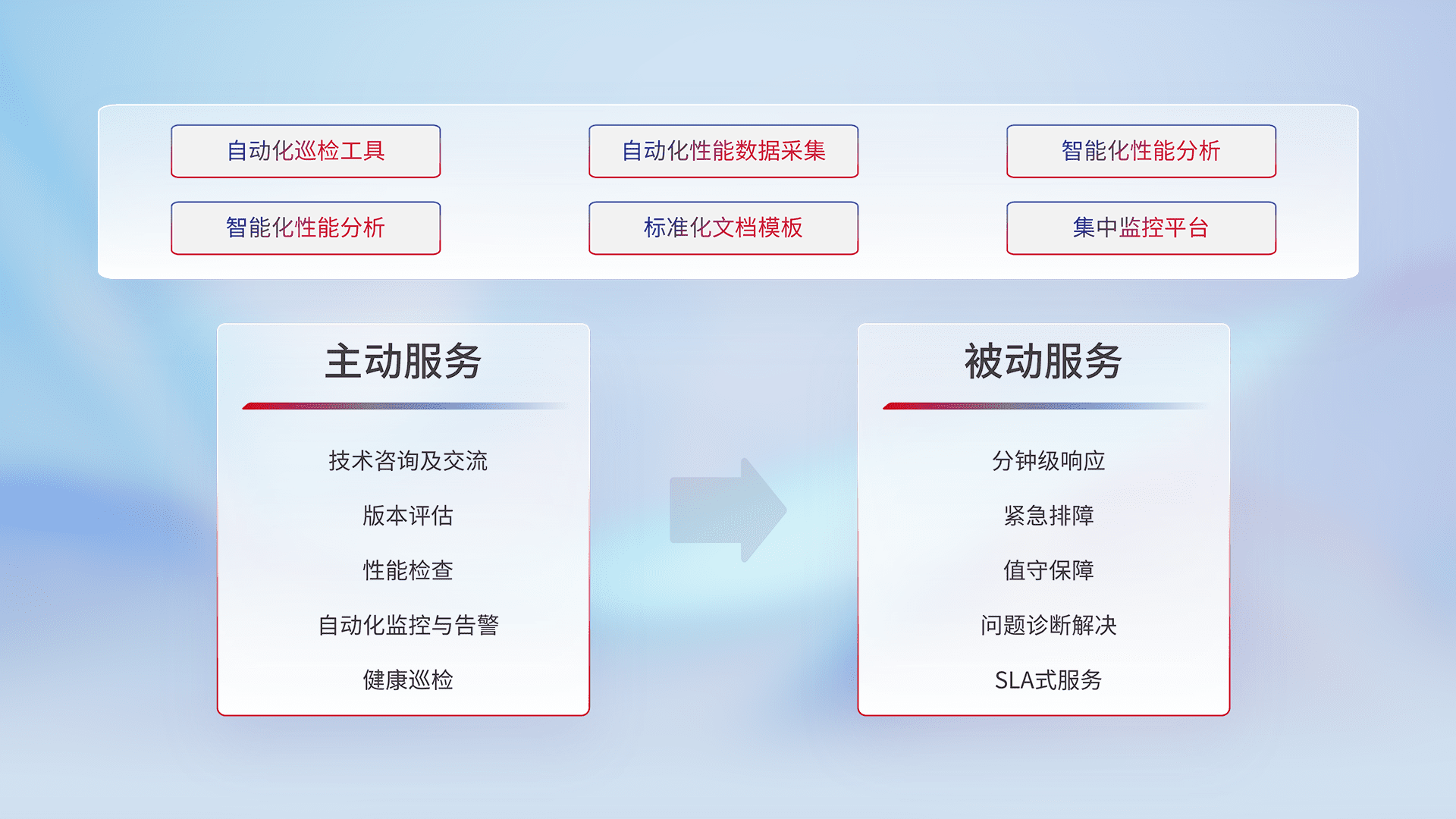 智能化工具和标准化文档,,保障服务质量,,提供主动服务(包含技术咨询、、、版本评估、、、、性能检查、、、、自动化监控与告警、、健康巡检)和被动服务包含(分钟级响应、、、紧急排障、、、、值守保障、、问题诊断解决、、、、SLA服务)。。